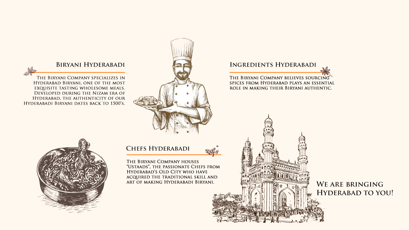 Established in 2015, ‘The Biryani Company’ is on a mission to bring the historic Hyderabadi Biryani to your doorstep. Our passionate chefs from Hyderabad’s Old City have kept the tradition of making authentic Hyderabadi biryani – our spices and ingredients arrive directly from our hometown of Hyderabad.